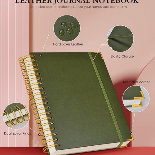 - 【Hardcover Leather Spiral Notebook Journal】 Made from high quality vegan leather, no animals were harmed. Sturdy and water-resistant hard cover can protect the inside of the page better than a soft cover and provides a comfortable writing surface. Each cover corner has golden rounded corner protector to prevent getting worn down or accidentally folding. We adopt rounded corner protectors keep your hands safe from harm.