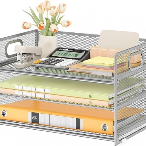 Subekyu 2-Pack 3-Tier White Metal Mesh Desk Paper Letter Tray & File Sorter Organizer with Handle + 1 Sliding Tray for Desk, Home, Office, School Supplies, A4 Paper and Accessories Storage