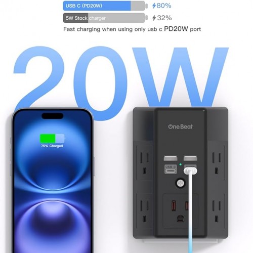 - 【9 in 1 Surge Protector with USB C】- The outlet extender is fit duplex outlet perfectly, just plug in to use. You will get 5 AC outlets with the wide space in between and 4 USB ports(2 USB C PD20W), the screw at the middle and the plastic prong on back for fixing duplex outlet, you don’t worry about falling off. The outlet splitter can charge up to 9 electric devices at same time, is a perfect electrical equipment for your different needs.