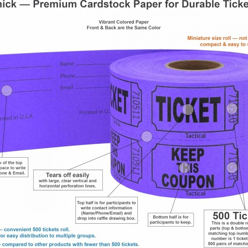 Tacticai 500 Raffle Tickets, Purple (1 of 8 Colors), Double Roll, Ticket for Events, Entry, Class Reward, Fundraiser & Prizes