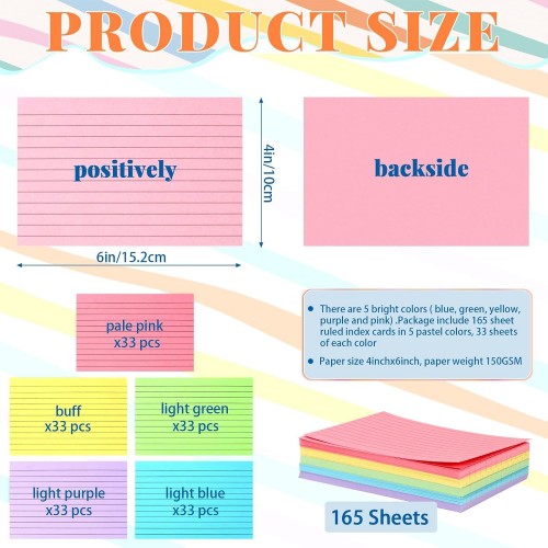 - Index Cards Bulk: Package include 165 sheet ruled index cards in 5 pastel colors, 33 sheets of each color
