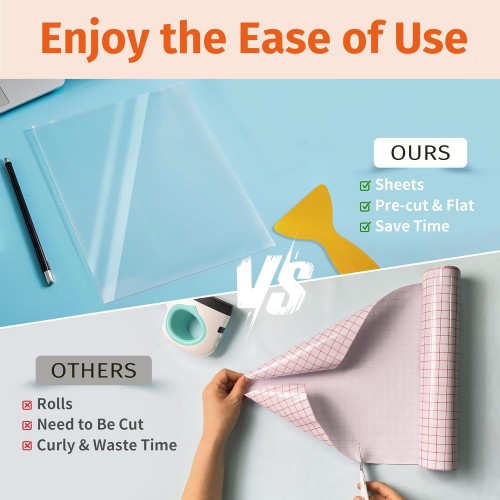 - đź’•SHEETS NOT ROLLS: This transfer tape is sized at 8.5×11″, which can perfectly match the size of Dark heat transfer. It comes in pre-cut sheets and remains flat during application. In this way, there is no need for cutting before use, nor multiple manual flattening operations. It can closely adhere to the heat transfer paper, greatly saving transfer time. Its user-friendly design makes it convenient for users. Whether for beginners or experienced professionals, it is an indispensable tool.