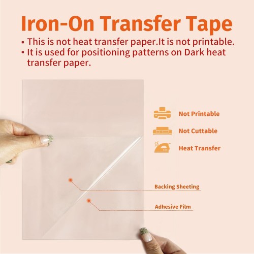 - πCLEAR IRON ON TRANSFER TAPE: It is clear iron on transfer tape, NOT clear heat transfer paper. This tape allows for precise registration, providing a perfect solution to the positioning problem of transferring complex designs of inkjet Dark transfer paper onto Dark cotton fabrics. Whether you’re working on intricate designs or simple logos, it can precisely showcase every detail. This transfer tape is clear, making the transfer process clearly visible and giving you professional results everytime. With it, you can customize your life and let your creativity flow without any restrictions. (Note:NOT printable&NOT cuttable&NOT suitable for self- adhesive vinyl.)