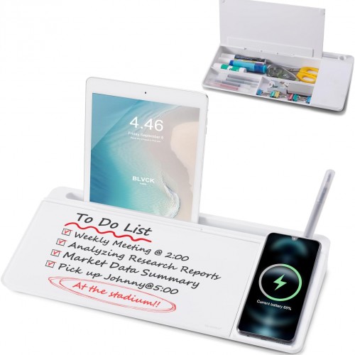 - HIDDEN STORAGE & PAD/MOBILE TRAY: De-clutter your desk by storing markers, magnetic eraser and other desktop accessories in the opening drawer or place markers on the accessory tray for quick access. And one more long tray on the top of the dry erase white board for your pad or mobile.