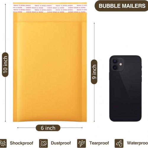 - Kraft Bubble Mailers: The yellow Kraft bubble mailers outer size is 6×10 inch, while the inner size is 6×9 inch, with yellow kraft paper, which color is bright and clean. Feel nice to the touch. Extra smooth surface is perfect for handwriting, labeling and stamping. With full air bubbles, our bubble mailers can protect your value products from damage caused by external impacts