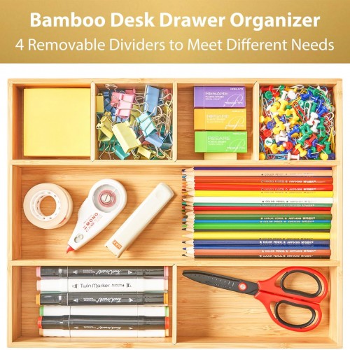 Umilife Large Bamboo Desk Drawer Organizer, Wood Junk Organizer Tray with Adjustable Dividers, Anti-Skip Storage Organization in Office Bathroom Drawer for Vanity, Makeup, 15″ x 12″