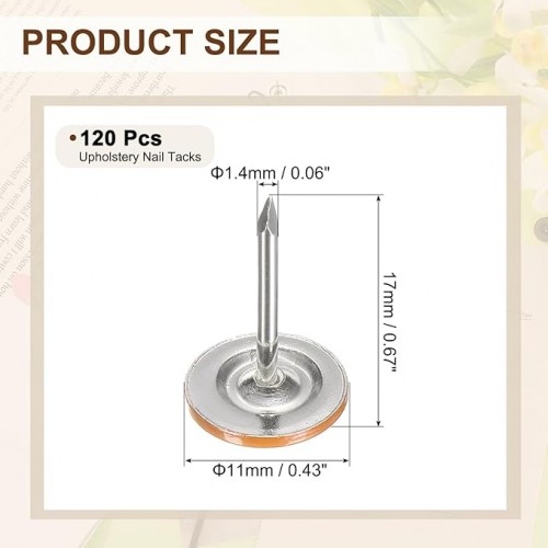 - [Size & Quantity] – The package comes with 120pcs decorative upholstery tacks. Sufficient quantity to meet your different daily needs. The overall size of upholstery nails is about 11mm x 17mm/0.43-inch x 0.67-inch(D*H)