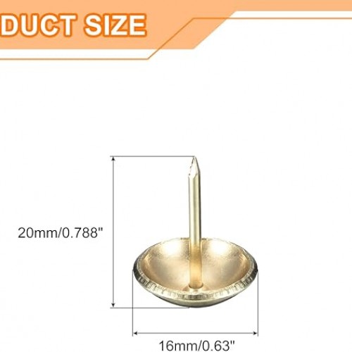 - Specifications: Material: Carbon steel; Color: Gold; Diameter of nails head: 16mm/0.63inch; Shank length: 20mm/0.788inch; Package Content: 100Pcs x Upholstery Tacks Nail Pins