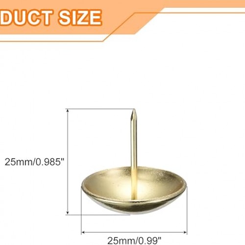 - Specifications: Material: Carbon steel; Color: Gold; Diameter of nails head: 25mm/0.99inch; Shank length: 25mm/0.985inch; Package Content: 50Pcs x Upholstery Tacks Nail Pins