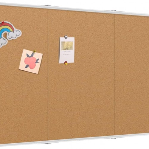 - [High Quality Details] Natural cork, Anti-scratch silver finished aluminum frame, ABS plastic corner with screw-fixing in corners. It can be folded in half for saving a space and more reliable transit. This board will add a classic look to your office or home
