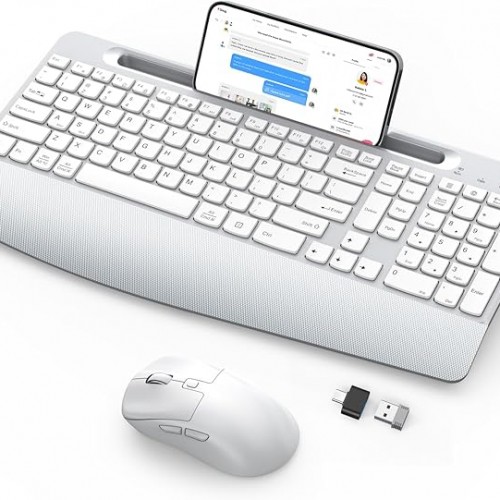- FULL-SIZE KEYBOARD WITH HOLDER – Even when working with this keyboard mouse combo, you’ll never miss any messages from your phone, since the built-in cradle can prop up your phone or tablet at a perfect angle to read or watch videos.