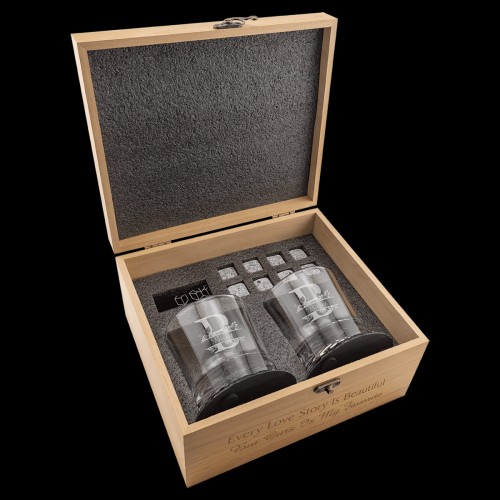 Custom Engraved Whiskey Gift Set – Red Alder Box with Glasses, Slate Coasters & Whiskey Stones